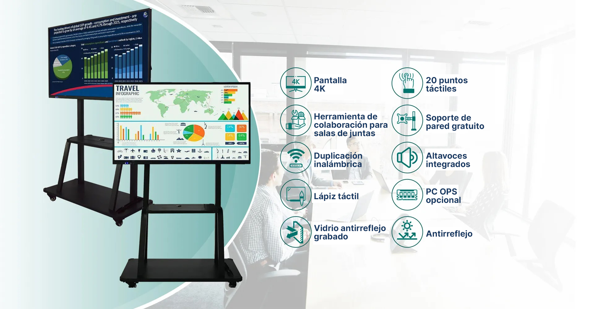 • Características del producto: Detección automática de luz, reuniones remotas, proyección de pantalla inalámbrica, escritura en pizarra,