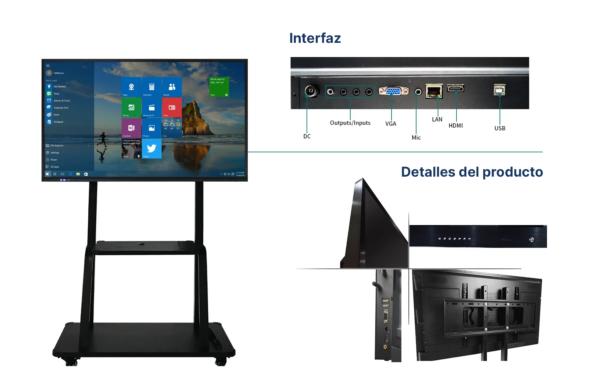 entrada, salida de red, entrada DP, ENTRADA DE AUDIO VGA, ENTRADA VGA, HDMI1 (ARC), HDMI2, USB táctil 2.0, USB3.0, USB2.0, tarjeta TF.